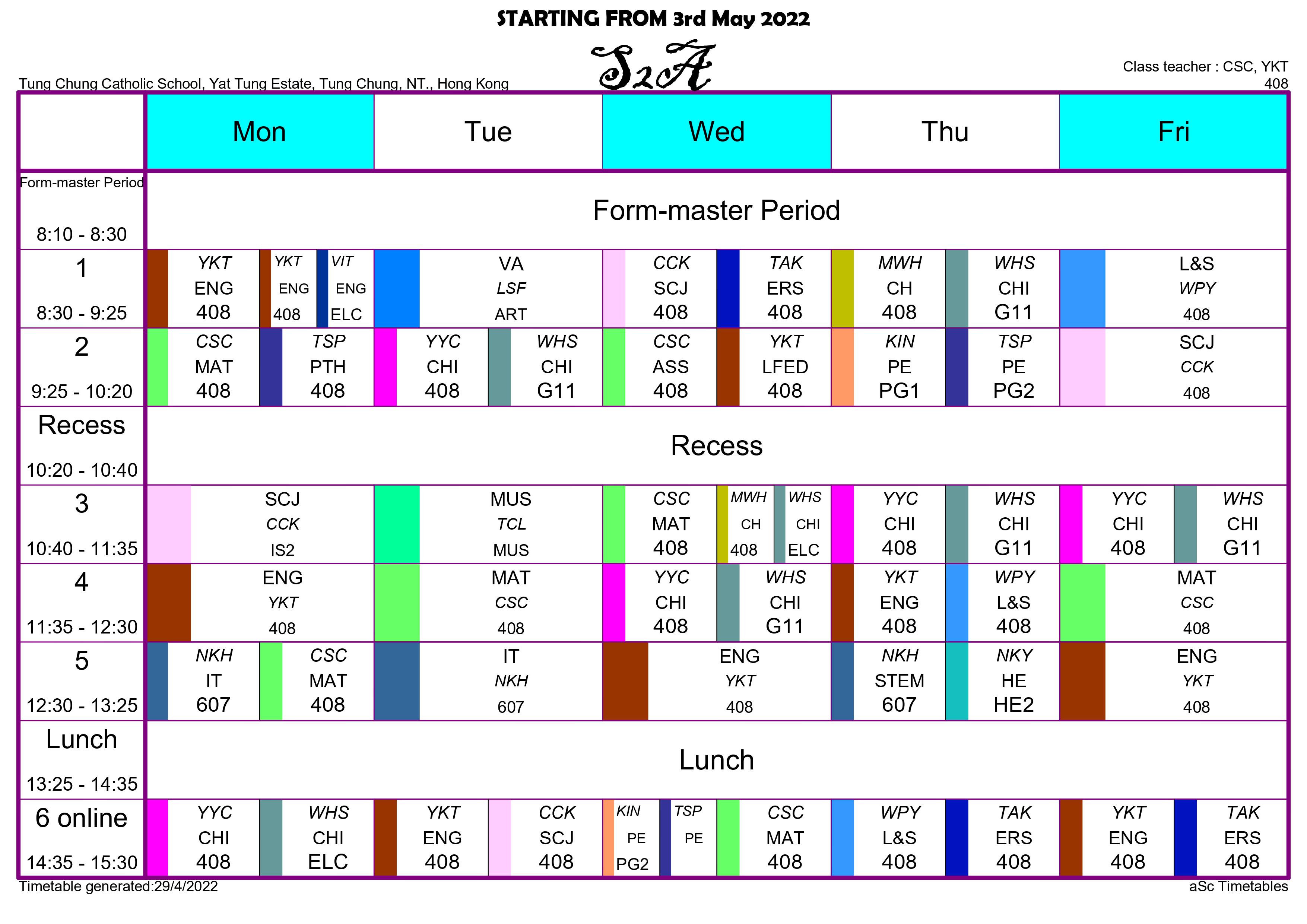 | CSC | 趙雪清老師 | 按此連結 Click this link | Yes (Microsoft Teams) - MAT + ASS + Form Master Period |