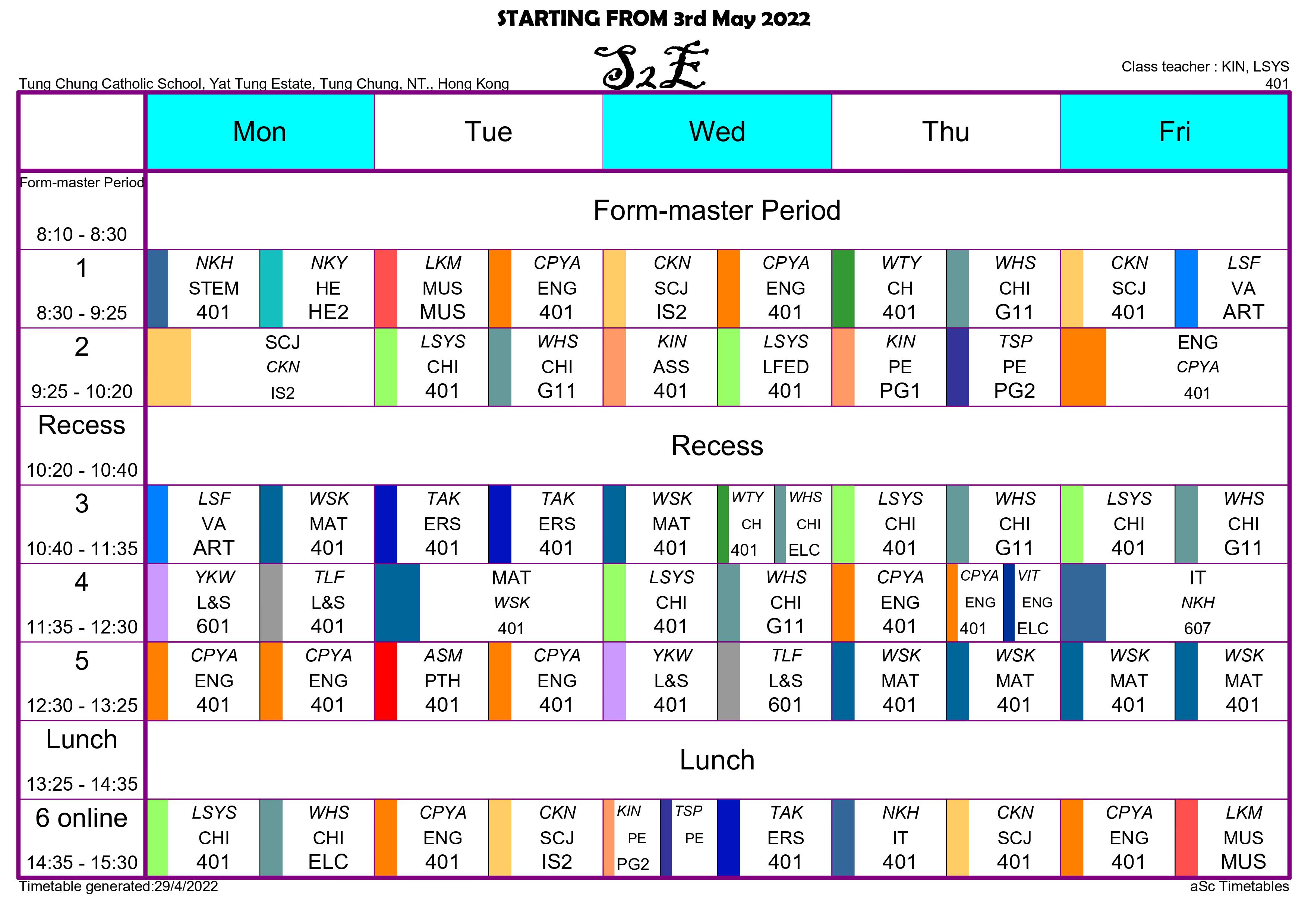 | KIN | 林順堅老師 | 按此連結 Click this link | Yes (Google Meet) - PE + ASS + Form Master Period |