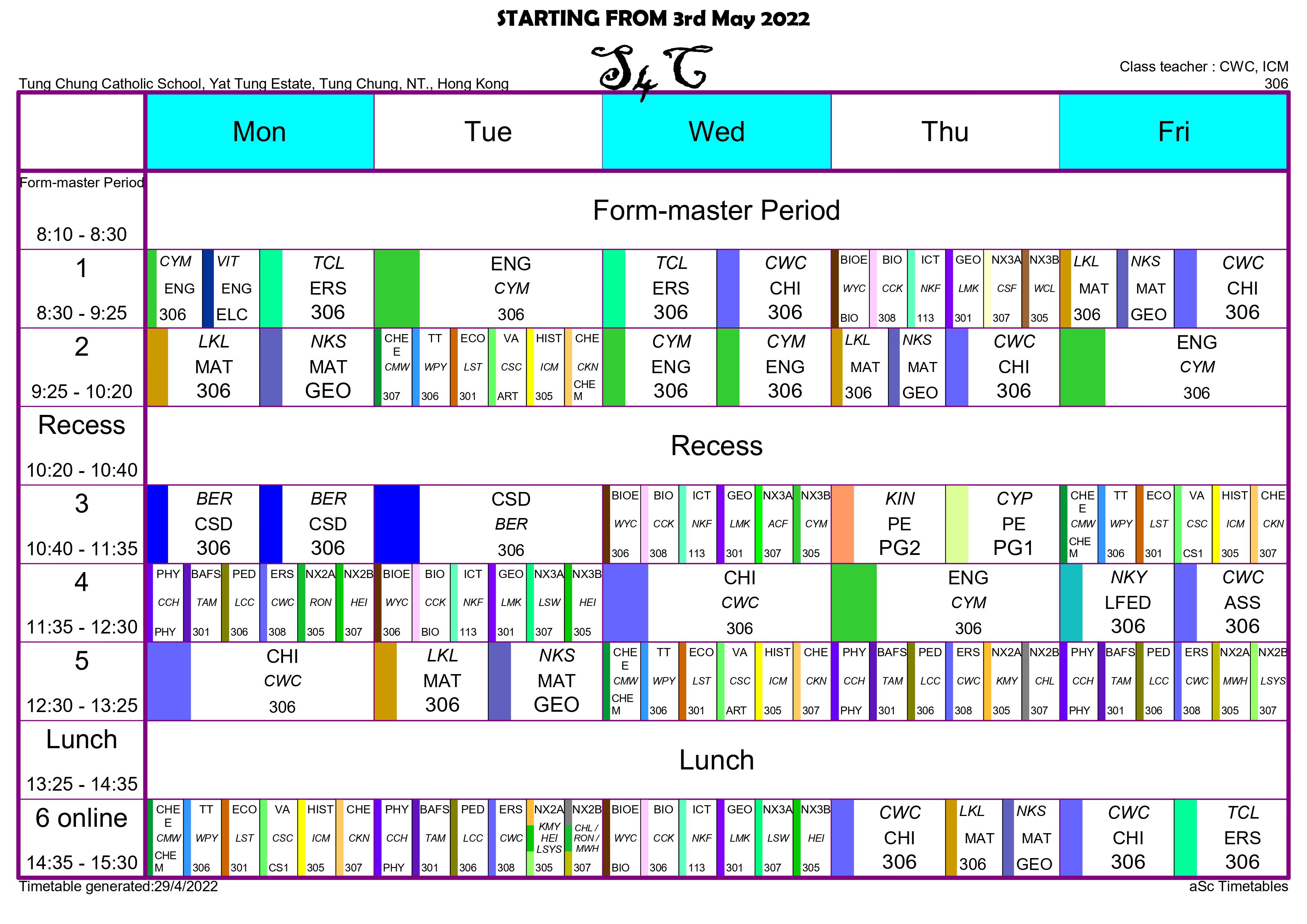 | CWC | 朱偉聰老師 | 按此連結 Click this link | Yes (Google Meet) - CHI + ASS + Form Master Period |