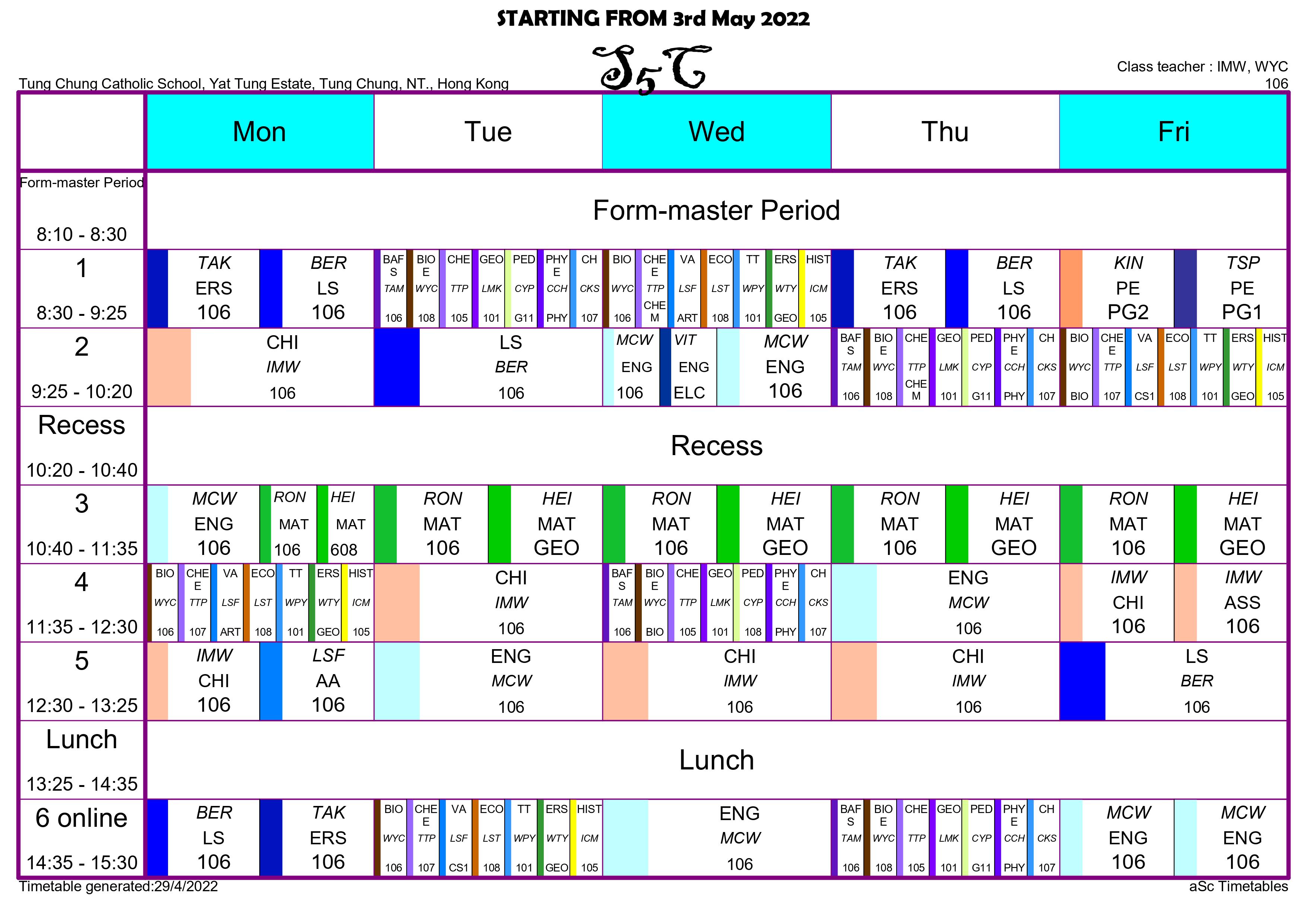 | WYC | 黃應昌老師 | 按此連結 Click this link | Yes (Google Meet) (中) BIO (X1) + Form Master Period |